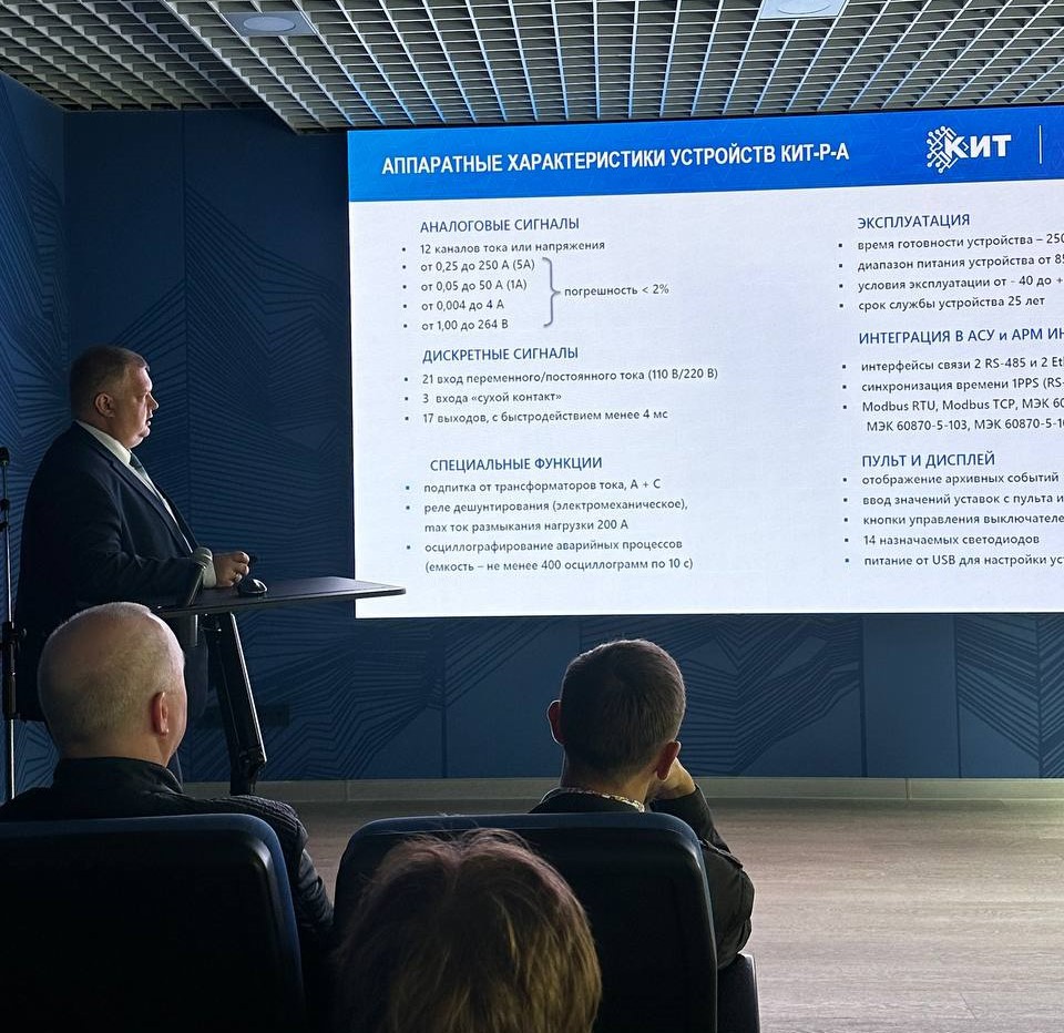 Завершил серию семинар по теме «Разработки ООО «НПП «КИТ» и области их применения в сетевых компаниях». Сергей Шелковников - заместитель директора по маркетингу ООО «НПП «КИТ» - предприятия, занимающегося разработкой и производством устройств релейной защиты и автоматики для всех типов присоединений в классе напряжений от 6 кВ до 35 кВ - рассказал участникам о новых решениях компании и внедрении в производство микропроцессорных устройств управления приводом устройства РПН, центральной сигнализации, релейной защиты и автоматики.